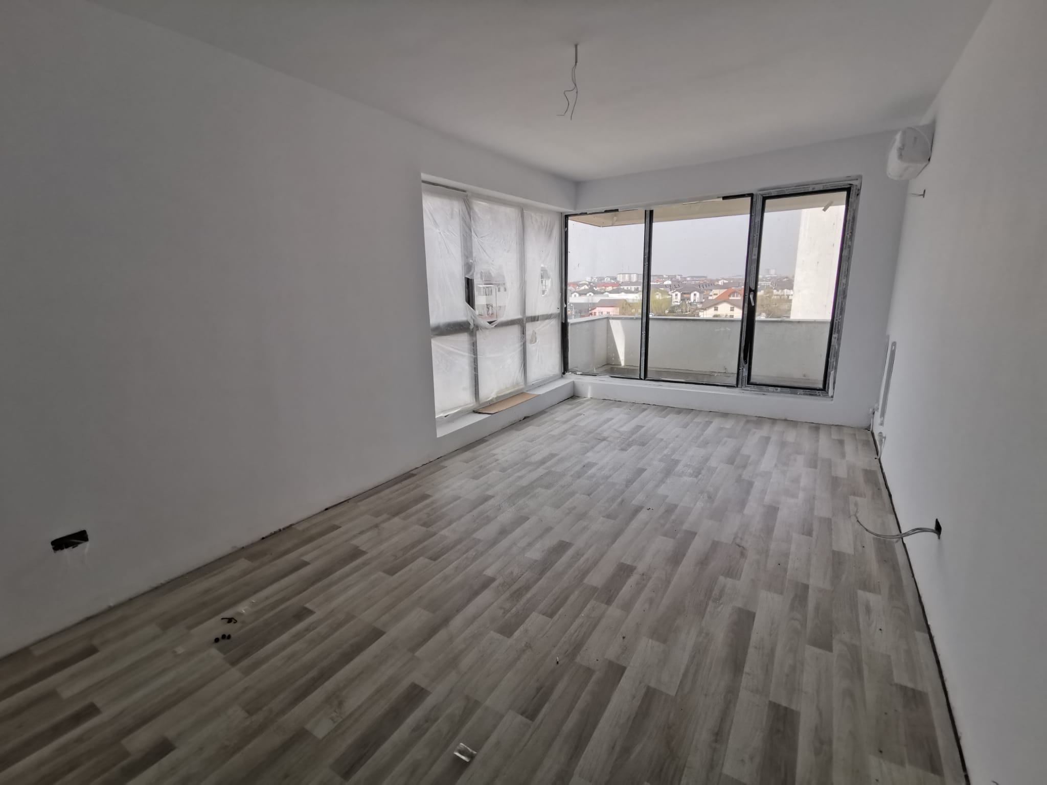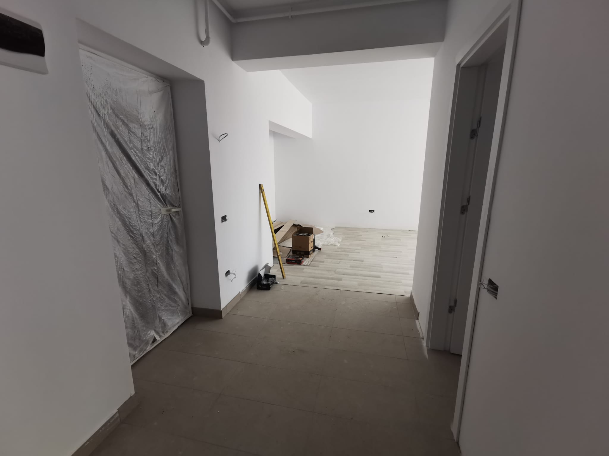 -Ușile de intrare în apartament sunt metalice, cu finisaj PVC, cu aspect de lemn și ramă metalică.