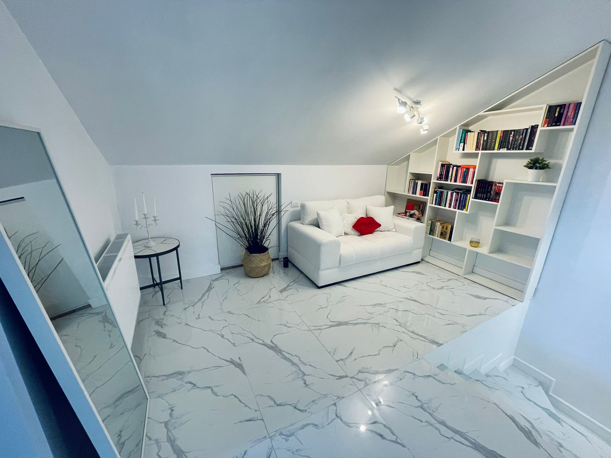 cu acoperis tip mansarda (compartimentata in 2 camere – dormitor cu baie proprie, birou, spatiu pentru citit si alt spatiu pentru depozitare) si prezinta solutii locative variate,