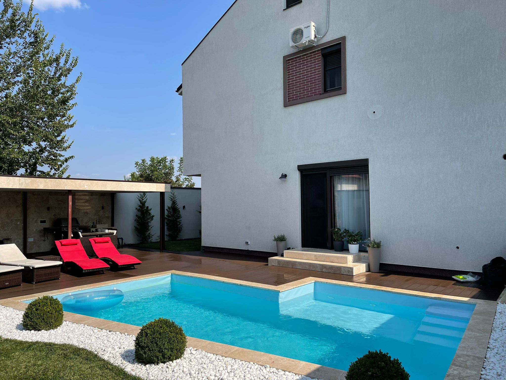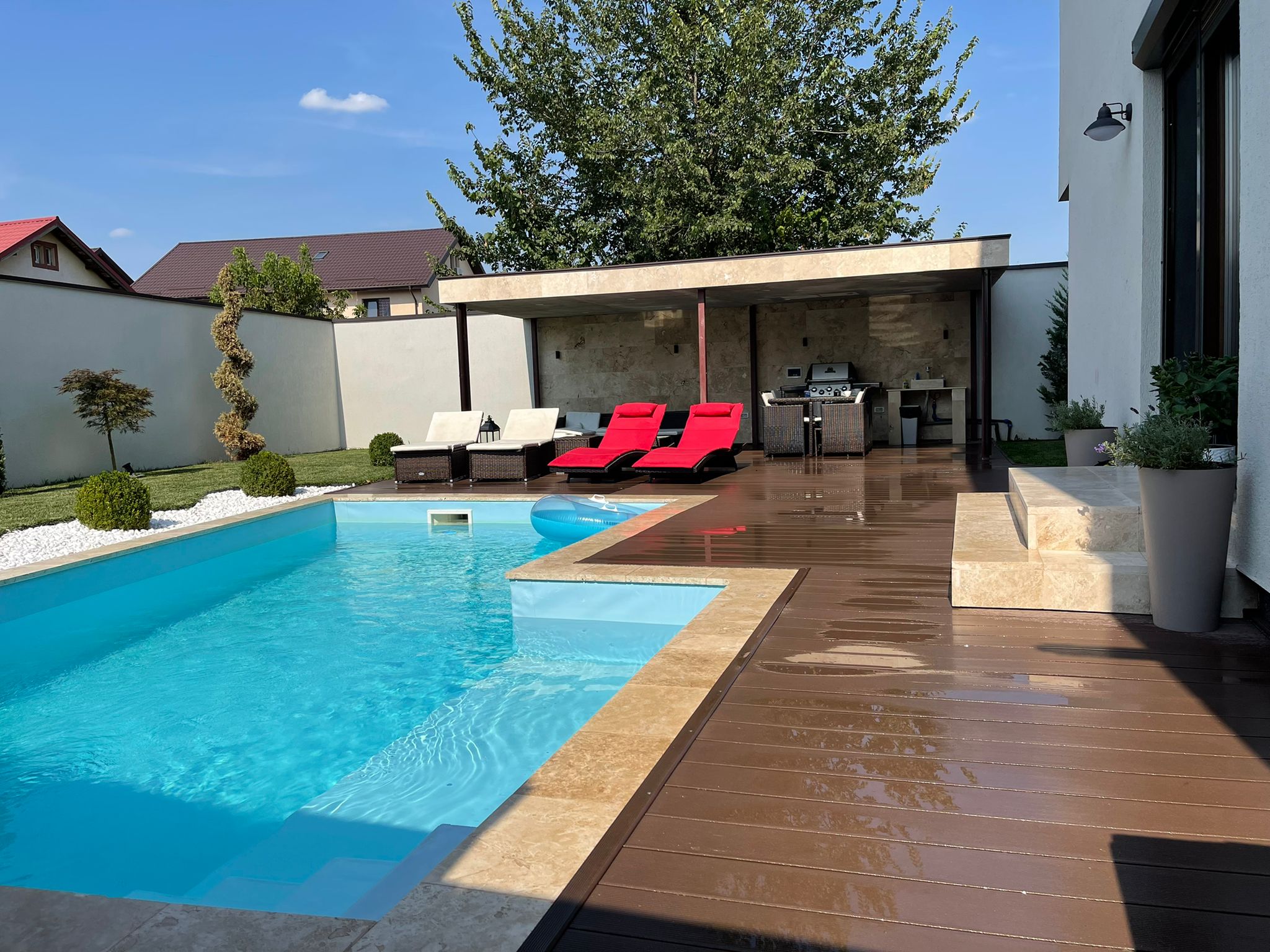 -Terasa acoperita, imbracata in travertin, cu spoturi pentru iluminat nocturn, aceasta dispune de masa pentru 8 persoane + canapea coltar de exterior, chiuveta cu scurgere in basa si alimentare din put.