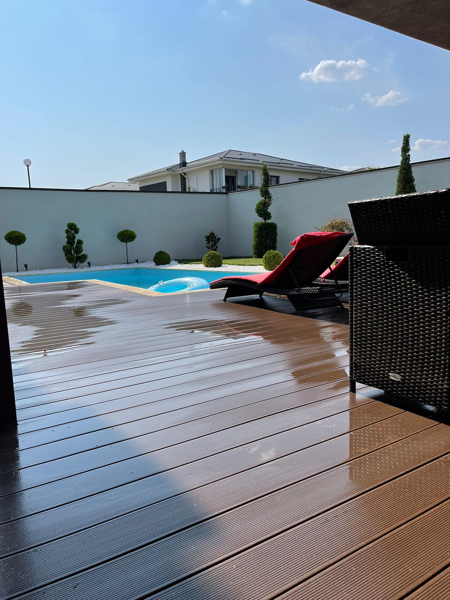 -Piscina imbracata cu Liner de culoare toscan, ce asigură etanșarea perfectă a piscinei, oferindu-i în același timp o veritabilă notă estetică.